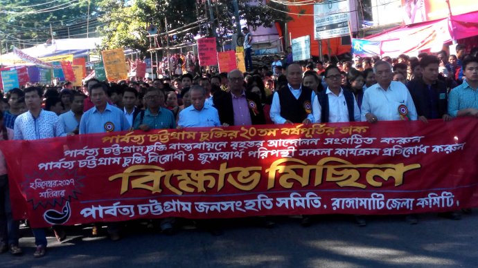 পার্বত্য অঞ্চলে শান্তি চুক্তি বাস্তবায়ন এবং নিজের অধিকার আদায়ের জন্য হাজার হাজার জনতা বুদ্ধিজীবি ও ছাত্র হাতে প্লের্কাড,ব্যানার নিয়ে রাঙ্গামাটির প্রধান মহাসড়ক প্রদক্ষিণ করে বিক্ষোভ মিছিলে যোগদান করে। গণসমাবেশে বিশেষ অতিথি হিসেবে চট্টগ্রাম বিশ্ববিদ্যালয়ের লৌক প্রশাসন বিভাগের অধ্যাপক হোসাইন কবির,চট্টগ্রাম কমিউনিষ্ট পার্টির সাধারণ সম্পাদক অশোক সাহা,জনসংহতি সমিতির তথ্য ও প্রচার সম্পাদক মঙ্গল কুমার চাকমা,বাংলাদেশ পার্বত্য চট্টগ্রাম আদিবাসী ফোরামের সভাপতি প্রকৃতি রঞ্জন চাকমা,পার্বত্য চট্টগ্রাম জনসংহতি সমিতি ও পার্বত্য চট্টগ্রাম পাহাড়ি ছাত্র পরিষদরের অঙ্গ সংগঠনের নেতৃবৃন্দ সহ বিভিন্ন প্রিন্ট এবং ইলেক্ট্রনিক মিডিযার সংবাদকর্মী উপস্থিত ছিলেন।