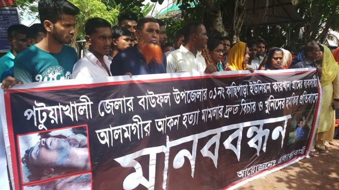 পটুয়াখালী বাউফলের কাছিপাড়া ইউপির কারখানা গ্রামের বিশিষ্ট ব্যবসায়ী আলমগীর আকন হত্যা মামলার দ্রুত বিচার ও খুনিদের ফাঁসি সহ হুমকির প্রতিবাদে বিক্ষোভ মিছিল ও মানববন্ধন করেছে এলাকাবাসি।